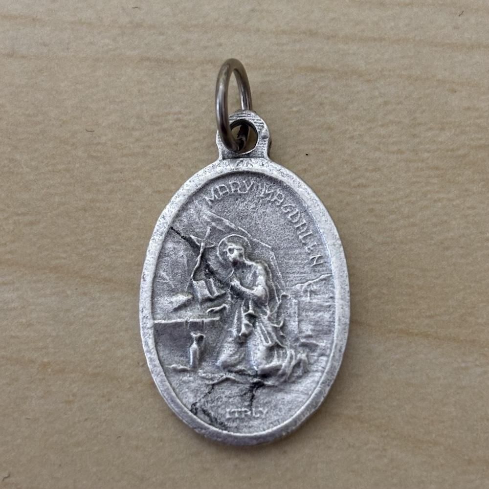 十字架と香油壷、書籍を傍らに置き祈る聖マグダラのマリアのメダイです。