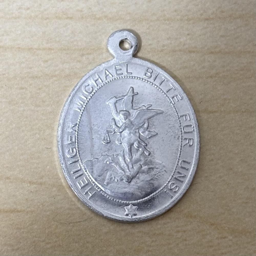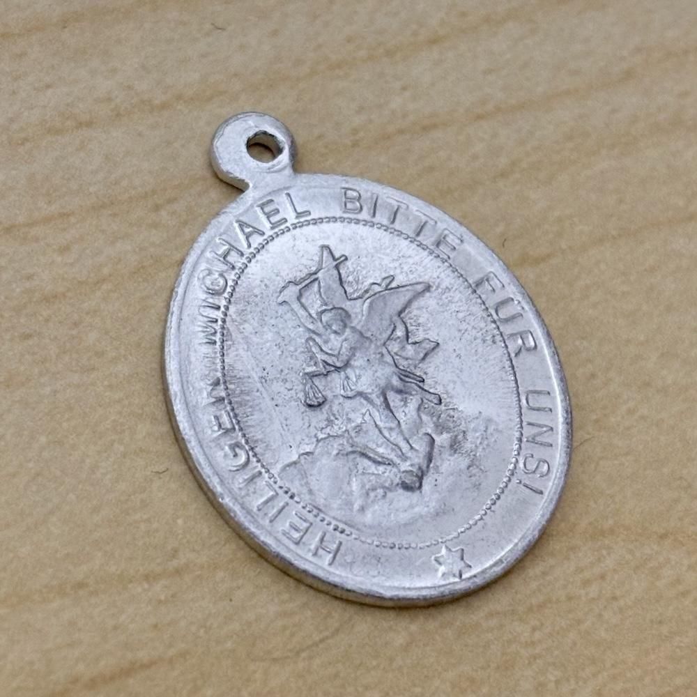 大天使ミカエルが龍と戦っている場面を彫ったアルミ製のメダイです。